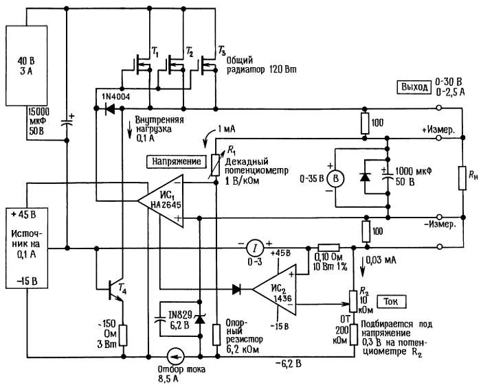Для стендового питания общего назначения важна возможность регулировать выход стабилизированного питания вплоть до нулевого напряжения, поэтому для питания стабилизатора используется дополнительный расщепленный источник. ИС1 — это высоковольтный операционный усилитель, который может работать при полном напряжении питания 80 В. На выходе в качестве проходного транзистора мы использовали параллельно включенные мощные МОП-транзисторы, исходя из двух соображений — простоты возбуждения затвора и превосходной ОБР (характеристическая особенность всех мощных МОП-транзисторов). Такая комбинация обеспечивает рассеяние достаточной мощности (60 Вт на транзистор при температуре корпуса 100 °C), необходимую даже для умеренных значений тока, если обеспечивается столь широкий диапазон выходного напряжения. Последнее объясняется тем, что нестабилизированное входное напряжение должно быть достаточно большим, чтобы обеспечить максимум стабилизированного выходного напряжения, а в результате при низком напряжении на выходе падение напряжения на проходных транзисторах будет большим. В некоторых источниках эта проблема решается тем, что используется несколько диапазонов выходного напряжения и соответственно этому переключается и нестабилизированное входное напряжение. Имеются даже схемы, в которых нестабилизированный вход поступает с регулируемого напряжением трансформатора, управляемого в такт с выходом. В обоих случаях, правда, теряется возможность дистанционного программирования.