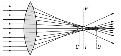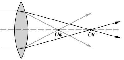 Рис. 3.2. Слева: хроматическая аберрация. Стекло преломляет коротковолновый свет сильнее, чем длинноволновый, и фокус фиолетовых лучей (Оф) лежит ближе к линзе, чем красных (Ок). При любом расположении экрана изображение звезды получается расплывчатым, в окружении цветного ореола. Справа: сферическая аберрация. Краевая зона сферической линзы фокусирует свет на меньшем расстоянии (точка С), чем центральная зона (точка D), и даже в области наилучшей фокусировки (плоскость fе) точечный источник проецируется как пятно.