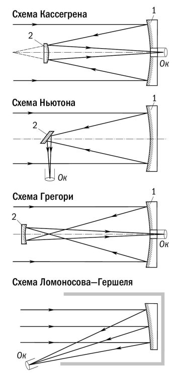 Рис. 3.7. Оптические схемы телескопов-рефлекторов. 1 – главное зеркало, 2 – вторичное зеркало, Ок — окуляр.