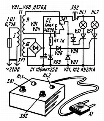 Конденсатор С2 подключен к обмотке II трансформатора и перезаряжается с каждым полупериодом сетевого напряжения. Поэтому в момент нажатия кнопки SB1 полярность напряжения на С2 может быть любой. Если на правом по схеме выводе конденсатора положительный потенциал, отопрется тиристор VS1 и загорится лампа HL1. Если же отрицательный — загорится лампа HL2 открывшимся тиристором VS2. Для приведения схемы в исходное состояние достаточно нажать на кнопку SB2.