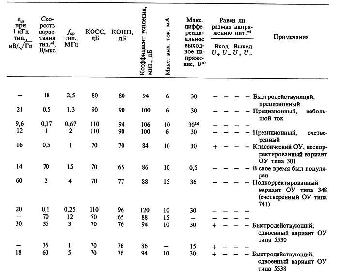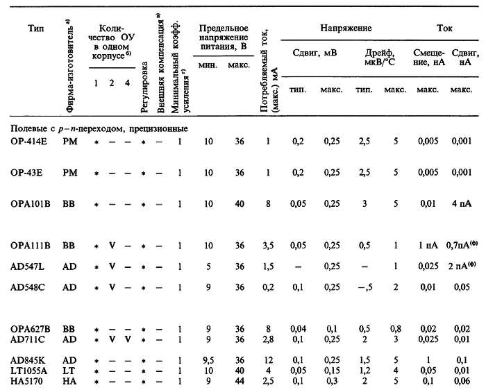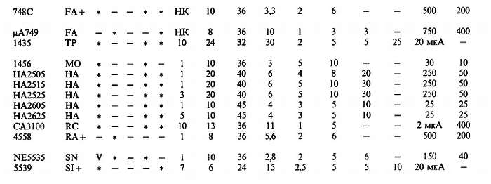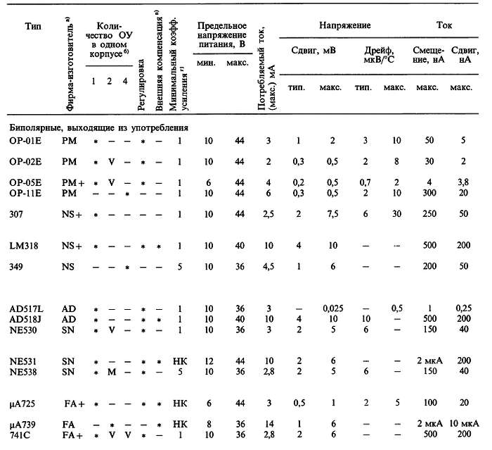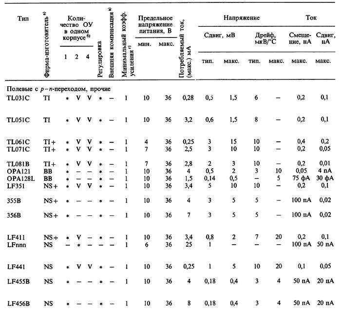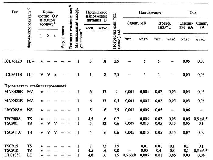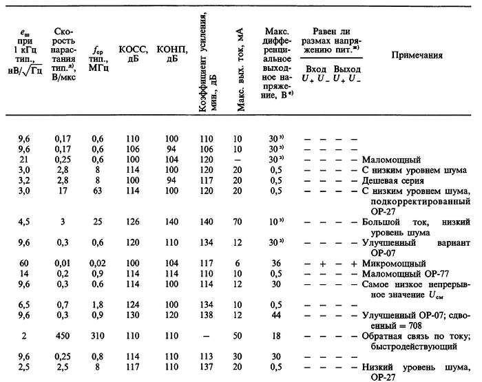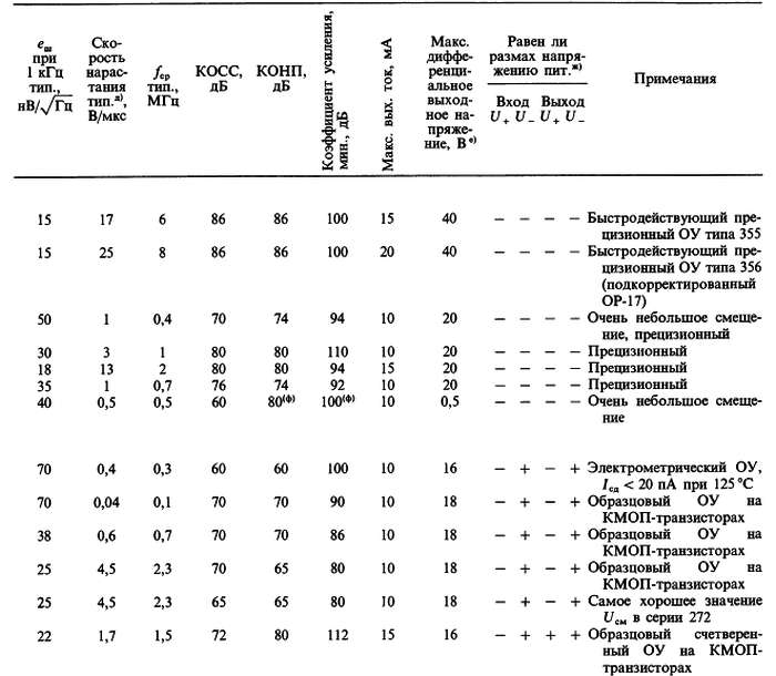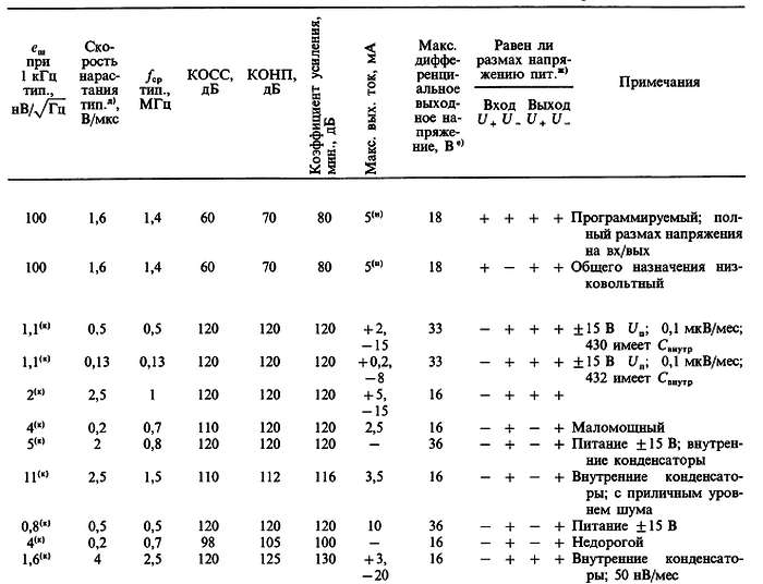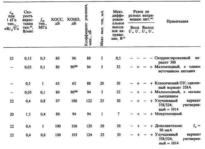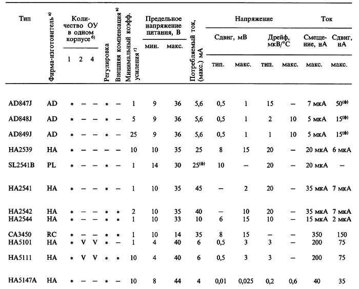 (б) «*» указывает на количество ОУ в одном корпусе; значок «V» — означает, что эта же фирма выпускает схему с другим количеством ОУ в одном корпусе; с увеличением плотности упаковки возможно некоторое ухудшение электрических характеристик (в особенности напряжения сдвига).