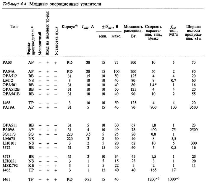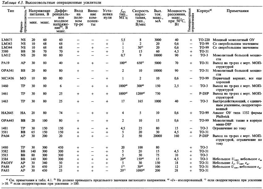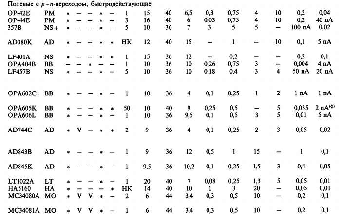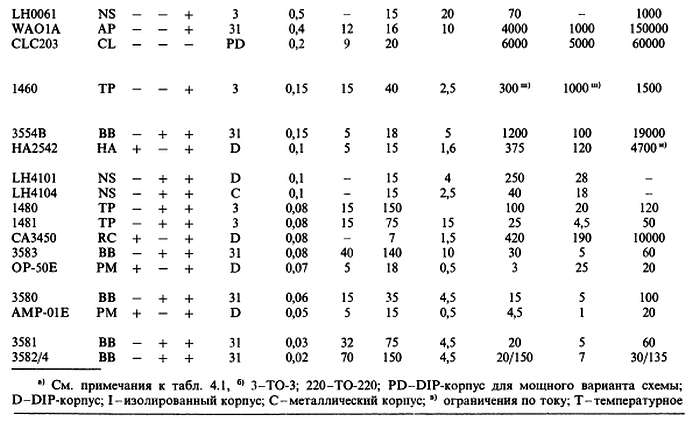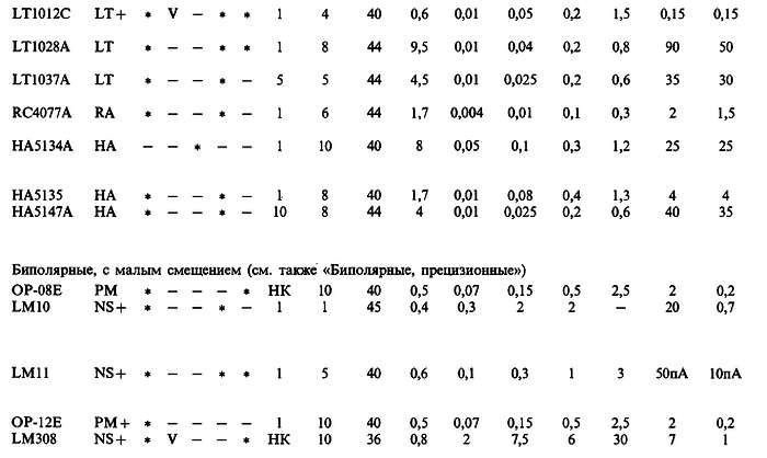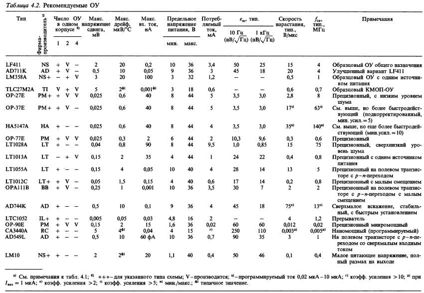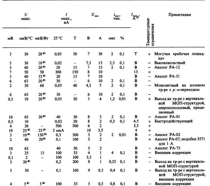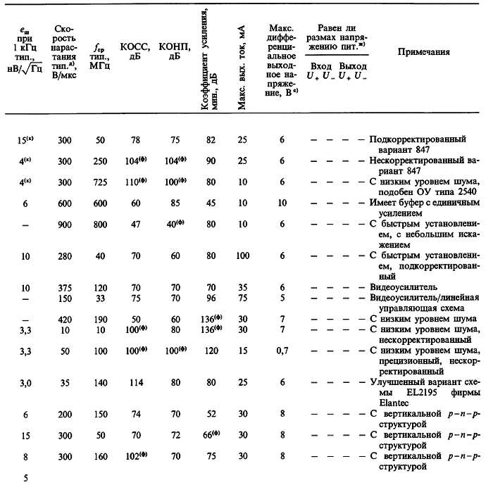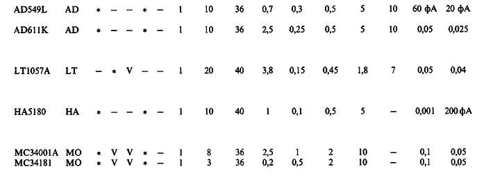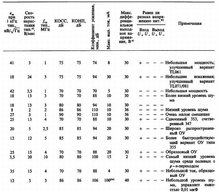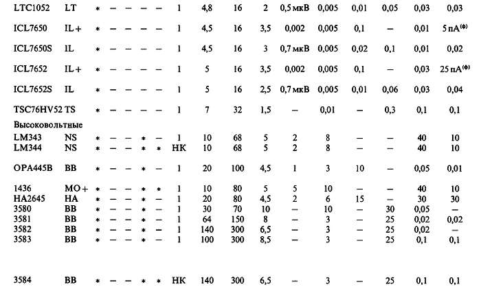 (б) «*» указывает на количество ОУ в одном корпусе; значок «V» — означает, что эта же фирма выпускает схему с другим количеством ОУ в одном корпусе; с увеличением плотности упаковки возможно некоторое ухудшение электрических характеристик (в особенности напряжения сдвига).
