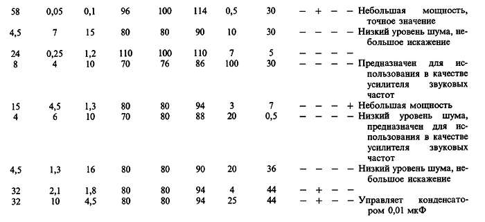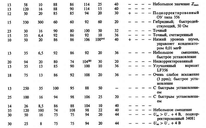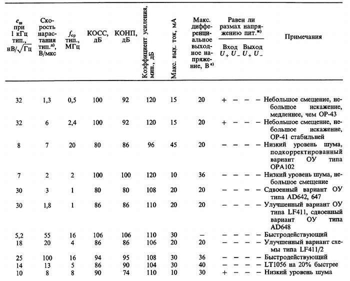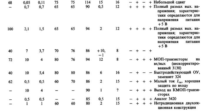 (ж) «+» в колонке ВХ означает, что диапазон входного синфазного сигнала включает это значение питающего напряжения; «+» в колонке ВЫХ означает, что размах выходного напряжения ограничен напряжениями питания. (з) Резистивно-диодная схема обеспечивает на дифференциальном входе ток больший, чем дает источник +1 В.