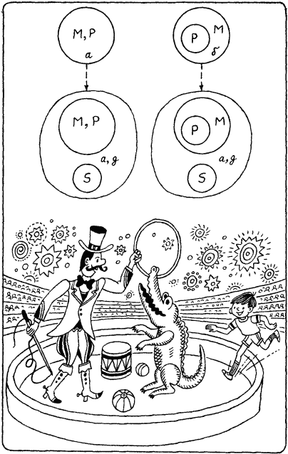 Возьмем первую и третью посылки. Если обозначить через Р класс сущностей с именем «малые дети», через М – с именем «неразумные люди», а через S – с именем «заслуживающие уважения», то получим схему взаимного расположения Р, М и S, которая соответствует схеме четвертой фигуры на рис. 10.