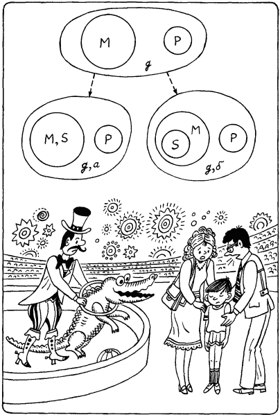 Если теперь М – класс с именем «заслуживающие уважения» (надо помнить, что М – единственный класс, имя которого встречается в обеих посылках), то Р соответствует классу «малые дети», a S – классу «укрощающий крокодилов». Такое введение классов сущностей приводит нас к первой фигуре силлогистики Аристотеля (рис. 10). Для получения вывода можно воспользоваться тем, что показано на рис. 16. В верхнем ярусе возможна только одна область истинности, а добавление к первой посылке второй приводит к появлению двух вариантов. Эти два варианта дают область истинности, соответствующую схеме базового высказывания Е. Таким образом, окончательное заключение разбираемого нами сорита выглядит следующим образом: «Всякий, укрощающий крокодилов, не есть малые дети».