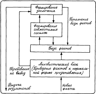 Наконец, в задачу лингвистического блока входит расшифровка входного сообщения. Эти сообщения могут быть двух типов: факты для пополнения базы фактов системы и факты, истинность которых хотелось бы установить. В первом случае факт после его перевода в нормальную форму передается в базу фактов, а во втором – поступает в блок формирования заключения, где он выступает в качестве задания на вывод.