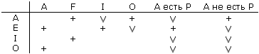 Они противоречивы тогда, когда в обоих высказываниях речь идет об одинаковых классах сущностей S и Р. Галочкой в таблице отмечены те пары, для которых тип высказывания, стоящий в столбце, есть следствие того типа высказывания, которым отмечена строка таблицы.