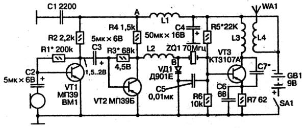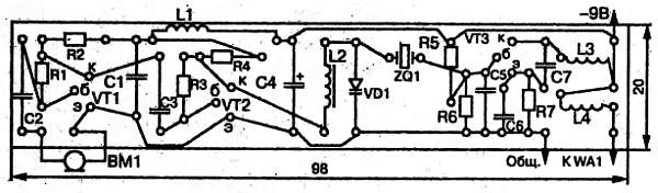 Сигнал с динамического микрофона ВМ1 подается на вход двухкаскадного усилителя на транзисторах VT1, VT2 с общим эмиттером. Резисторы R2 и R4 — коллекторные нагрузки каскадов, резисторы R1 и R3 определяют режимы транзисторов по постоянному току. Их сопротивления подбираются так, чтобы потенциалы коллекторов находились в указанных на схеме пределах. Постоянная составляющая напряжения вместе с усиленным сигналом звуковой частоты с коллектора VT2 через дроссель L2 поступает на варикап VD1, который входит в состав колебательного контура ZQ1, VD1, С5. Кварцевый резонатор здесь выполняет функцию индуктивности. Генератор высокой частоты 70 МГЦ собран на транзисторе VT3 с положительной обратной связью через конденсатор С7, емкость которого подбирается с учетом максимального тока коллектора. Резисторы R5, R6 задают режим транзистора по постоянному току. После подбора С7, подбирая сопротивление резистора R5, устанавливают ток коллектора равным 25 мА. Дроссели L1 и L2 служат для развязки усилителя звукового сигнала и генератора высокой частоты по цепям питания.