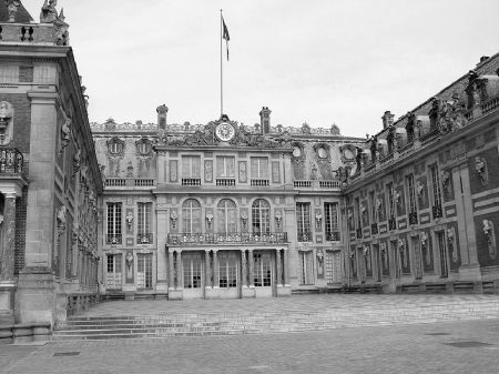 В Версале было очень много различных почетных дворов, среди которых видное место занимал Мраморный. Сюда выходили королевские покои, поэтому часто под балконом комнаты Людовика XIV разыгрывались театральные представления. На этой «сцене» труппа Мольера впервые играла «Мизантропа». Над высокими окнами королевской комнаты над аттиком поднимается фронтон, украшенный скульптурными рельефами. На нем были установлены часы, которые в момент смерти Людовика XIV остановили. В XVII веке они еще долго показывали последний час короля, но впоследствии их циферблат заменили, хотя сам механизм остался прежним. Часы ходят и теперь, показывая точное время.