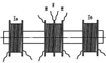 Главное отличие этой схемы состоит в применении двухполупериодного детектора, собранного на транзисторах VT1 и VT2, обладающего более высоким коэффициентом передачи по сравнению с диодным однополупериодным детектором. Кроме того, в этой схеме используется выходной трансформатор Т2, позволяющий применить низкоомную динамическую головку ВА1. Более сложной оказалась магнитная антенна, катушки которой расположены в соответствии с рис. 4.