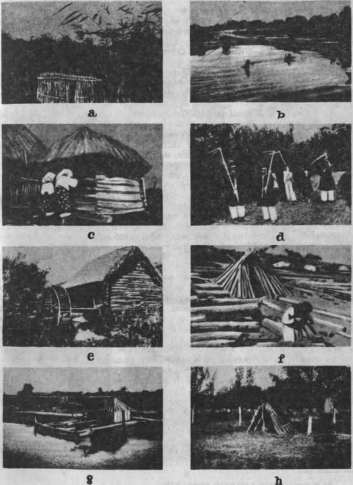 Ми не можемо довго спинятися на приміщеннях для скотини: кошарах, стайнях, хлівах, загонах, повітках тощо, які в своїх особливостях, іцо залежать переважно від будівельного матеріялу та піддягають тим самим умовам, що й хвти На півдні ці будови бувають земляні чн очеретяні, в середній смузі майже скрізь плетені з лози або з хворосту, на півночі — складені з брусів. Хлівн з глннн обмазують рідко, особливо ті, що призначені для корів та овець. Иноді їх ставлять з подвійної ліски, набиваючи в проміжжя між лісками кізяку з землею. Таку подвійну ліску звуть загатою. Виняток щодо матеріялу являє собою тільки саж. цебто хлів для свиней, що їх відгодовують; саж завше ставлять дерев'яний, у зруб. Ми даємо тут фотографію, яка демонструє, між иншим, оригінальне спорудження, так звану ляду, цебто дверці, що підіймаються, дозволяючи засипати худобі пашу, не відчиняючи для того дверей (табл. VI, с). А звичайно приміщення для безрогих, як звуть у Галичині ввічливо свиней, ставлять просто з ліски, часто з виходом просто на вулицю. Велику птицю, як гусей, качок, тримають найчастіше в хлівах, а для курей ставлять окремі курники або тримають їх під стріхою в сінях, особливо коли сіни мають стелю. В Бессарабії, однак, і кури, і навіть индики ночують майже завше на деревах. Для голубів ставлять окремі голубники на високому стовпі аби під гребінем стріхи, иноді також вішають для них під стріхою плетені з соломи гнізда, які теж звуть голубниками. Нарешті, до кожного двору конче належать ріжного роду повітки, цебто надвіси. відкриті чи закриті, в яких працюють за негоди, куди складають дрова, сіно тощо; сюди теж належать возовні, де ставлять плуги, борони, вози, сани тощо, замісць них у бойків роблять надвіси. прибудовані до самої хати та які звуться колешні.