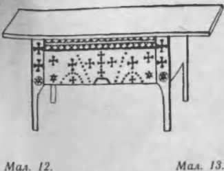 Ліжко або постіль оздоблена у них також,— а иноді й у бойків,— дуже старанною різьбою (мал. ІЗ).
