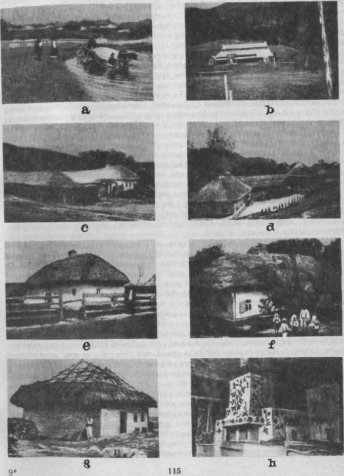 1) Розполог села. Переходячи до постійного житла, треба хоч кількома словами звернути увагу на розполог села. Проголошену не так давно як науковий винахід теорію Мейтцсна про етнічну ріжницю в розполозі сел у німців та у слав’ян, ближче розглянувши їх, прийшлося визнати за мало що варту, бо ж факти підтверджують, що етнічні звички в даному випадку зовсім не такий уже могутній чинник, як, наприклад, рельєф місце вости; але в дальшому викладі ми побачимо, що до певної міри треба припускати і вплив етнічних причин. Дуже яскравим доказом залежности розпо-логу дворів у селі від умов місцевостн можуть бути саме українські села, що з цього боку дуже ріжниманітні, майже вибагливі Прикладом початків утворення сел можуть бути гуцульські селища. У гуцулів, власне кажучи, села ще майже немає, а коли воно й є, то це тільки рудимент його, що починає тільки ще формуватись. Окремі оседки, цебто хати-диори гуцулів, оточені обробленими шматками грунту, розкидані по горах на ріжній високості і, явна річ, без жадного плану, на віддалі од версти до 4—5 верстов один од одного, в залежності лише од того, де знаходиться вода. Вздовж долинок гірських струмків та річок на ріжній віддалі видно більше хат В таких долинах, особливо там, де вони сходяться з долиною трохи більшої річки, як-от Тиси, обидвох Черемошів, Пруту,—вже з’являються: церква, попівство чи плебанія, громадський дім. крамниця та кілька хат. звичайно вже без гражди (про це днв. далі). Це все разом і становить початок майбутніх сел. що вже тепер мають титул, дарма що вони такі ще незначні; до такого «села» зачислюються часом сотки дворів та иноді дві-трн тисячі населення, бо до цих початків села приписані всі оседки з їх населенням, що лежать в тій самій околиці на певній віддалі. Такі майже всі гуцульські села: Яворів, Криворівня, Довгополе, Брустури, Ріка, Білий Поток, Требуша та ин. А там. де сходиться кілька долин, розвинулись уже значно більші поселення, такі як Жаб'е, Сторонець-Путилів, Селятин, Богданів, Ясенів (K?r?smes?). Цілком иншого типу села бойків, з розпологом найбільше в одну, зрідка у дві лінії в вузьких долинах, вздовж річок Стрия та Опора (Гребенів, Тухля, Влоцко та ин.) та в долині Сяну (Дидьова, Мшанець та ин ). Тут, навпаки, населення скупчується та осідає цілим, майже без перерви, рядом сел, що майже сходяться одно з одним, як це можна бачити, наприклад, в долині Стрия між Баринею та Матковим. На рівнині розполог села, явна річ, ріжноманітніший. По річках з каменистими берегами, як Тетерів, Рось та инші, села найбільше розкидані, відзначаються вибагливим характером; у степових місцевостях, на Чернигівщині. на Полтавщині села розміщені також звичайно по течіях річок, але в залежності од підвищень, що виступають з болотяних берегів річок. По річці Десні села групуються найбільше по долинах її припливів та положені на терасах, куди ие доходить повінь, тому вони здаються й розки дані. Глибокі балки на Херсонщині викликають зі свого боку до життя села, що витягнуті вздовж берега річки в одну чи дві лінії. Дуже рідко трапляються, а то майже й зовсім не трапляються на Україні села з двох тільки шерегів хат, вздовж дороги, як це властиво для Великоросії: можливо, що тільки це й становить етнографічний характер розпологу села, бо цього не можна відкинути, хоч як необгрунтована теорія Мейтцена щодо германських т