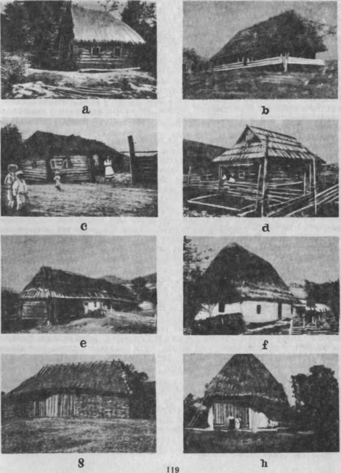Коли ми звернемось тепер на захід од колишнього російського кордону, то майже до самого підложжя Карпатів ми бачитимем такі самі хати, з острішками на солом'яній стрісі, як на Київщині, південній Волині та на Поділлю, з тою тільки ріжницею, що в Галичині та на Буковині хати більші, кращі, багатші, ніж на Великій Україні (кріпацтво скасовано в Галичині р. 1848. а конституцію заведено р. 1866); хати там дуже часто мають маленькі галерії вздовж передньої стіни (табл. IX, в), а иноді об’єднані з господарсь-кнми будинками, як за це вже згадувалось вище. Але вже на карпатському Підгір'ї загальний вигляд хат починає мінятись. Не так впадають на очі ці «міни на Покутті, де до самої Буковини панує ше загальноукраїнський тип хати. На Бойківщині та на Лемківшині. де будова ускладняється об'єднанням хати з господарськими будинками, хата виділяється хіба шо тільки тим, що вона білена; а трохи вище, на горах, зникає й білення, і хата в спільній довгій будові відзначається тільки вікнами, часто трьома з чільного боку, та ще иноді галерейкою. Хати, шо стоять окремо, мають теж галерейку, відзначаються великими розмірами та солідністю будови і нагадують хати загальноукраїнського типу тільки своїм внутрішнім планом та стріхою з острішками, а иноді й з уступами вздовж цілої стріхи (табл. IX, в). А на півдні Кар-патів, понад горішніми течіями обох Черемоші» ти Пруту, а також.— правда, тільки почасти,— на горішній Тисі, вже в горах, вже цілком панує гуцульський тип, що про нього почасти ми вже говорили више. Гуцульська хата збудована тільки з дерева, брусовані зруби вкриті дерев'яним дахом, що поширений і на передню огорожу, гражду, і через це хата закрита з усіх боків. На формі даху помітні, однак, ше пережитки від солом'яної стріхи: він чотирьохехилий та »авершуєтьсм високим продовжним гребінсм, а ребра його трохи закруглені (табл. VIII, в). Між типом гуцульської хати з граждою та хатами гуцульського Підгір'я, звичайно, існує н ряд переходових форм. Вже на Підгір'ю гуцульських Карпатів, в селі Ясені на Прислопі починаються невеликі або зовсім небілені, або почасти обмазані глиною хатки з дерев'яним дахом У гуцульському Ясені (K?r?sniesij) хати вже небілені. з високим гуцульським дахом та з прибудовами ззаду, але ще без гражди (табл. IX. Д), а в Яворові, Жабйому, в селах, що лежать вище, за Чорною Тисою, та в инших уже цілком гірських селах гуцульські хати досягають свого повного розвитку та замкну тости