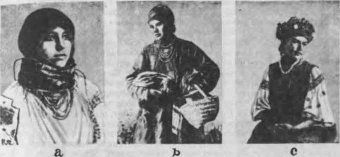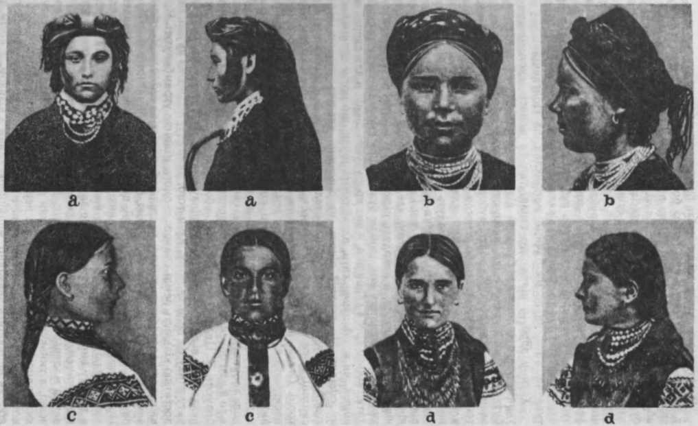 Крім квітів та стрічок— оздоби загальної для цілої України,— в деяких місцевостях її утрималися ще й мідні ланцюжки, намистинки, а то й оздоби так само примітивні, як і квітки, що переховались з часів глибокої старовини. Це ?— вінки з пір’я або височні чи надлобні оздоби, теж із пір’я, або з мідних підвісок. Дівчата у бойків вплітають до вінків пав’ячі пера, а жінки в Старо-більському повіті на Харківщині застромлюють їх навколо хустки. Вінки з пір’я зазначає Чубинський без зазначення місцевостей, а нам доводилося їх зустрічати на волинському Поліссі. Там їх роблять з дрібного курячого пір’я, пофарбованого зеленою барвою. На галицькому Поділлі дівчата затикають у волосся гусячі пера, вмочуючи їх перед тим у розтоплений зелений віск, а часом і обліплюючи їх позолоткою. Вибір самої тільки зеленої барви можна пояснити, мабуть, бажанням наподобити барву рослини; можливо, однак, почасти пояснити це звичаєм, що існує ще на півдні Київщини (село Свинарка Черкаського повіту та село Вербієвка Звенигородського пов.),— робити налобні оздоби,— а в Старобільському повіті на Харківщині — височні,— з зеленого качиного пір’я, переважно з закрученого пір’я з хвоста качура. На Київщині це пір’я встромляють між двома вшитими вздовж стрічками, що потім їх нав’язують на лобі нижче вінка. Формою вони дуже нагадують гуцульське чільце (од слова чоло), що складається з підвішених до дрота вузьких мідних пластинок, які мають вигляд чи маленьких стрючків, чи пелюстків квітки; чільце носять на лобі, теж під вінком, здається, тільки самі молоді. Це чільце теж являє собою безперечний пережиток старовинної налобної оздоби князівського періоду, запозиченої з Візантії та яка дістала назву рясна. Гуцульське чільце, що я його придбав для музею Імп. Олександра III, своїм малюнком дуже підходить до подібної оздоби на мал. 1089—90 у випуску «Древностей Придн?провья» Б. И. Ханенка. Друга форма, що в ній існує у гуцулів та сама оздоба,— це ремінчик або шнурок з нанизаними на ньому у великій кількості пластинками з жовтої міді, вирізаними в формі пелюстка чи листочка з потрійним розгалуженням. Ця форма також досить архаїчна, бо ми її зустрічаємо коли не в формі діядеми, то в вигляді похоронного вінка (пор. «Древности Придн?провья», т. VI, табл. IX, 630) в одній з грецьких гробниць у Керчі. Крім гуцулів, подібні оздоби переховались ще у сербів у вигляді невеличких підвісок, що являють собою мініятюрні наподоблення ріжних річей та нанизані на шнурок або на ланцюжок; трапляються вони й у инших південних слав’ян, в яких вони, мабуть під турецьким впливом, складаються з дрібних монет, иноді золотих, але здебільшого фальшивих, що навмисне для цього фабрикуються.