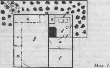 Цн оригінальність розпологу виникла в них, мабуть, під впливом німецького будівництва, що прищепилось тут безпосередньо від словаків. Тому н сліди замкнутого двору тут дуже мало помітні. Цілком ннакше стоїть справа в долині, цебто на Галицькій рівнині. Там, дарма що загальний, зовнішній характер дворів зовсім не подібний до гуцульського, досить часто трапляються все-такн двори з виразною замкнутістю. Як на приклад ми можемо вказати на деякі двори, що знаходяться на Волині, в Бродській окрузі. Це звичайні українські двори, але цілком замкнуті, і в них, зовсім так само, як і в гуцульському дворі, всі будинки знаходяться під одною стріхою і творять прямокутник з одними чи двома воротами; другі ворота ведуть із стодоли в поле. В цій самій місцевості можна спостерігати і диференціяцію плану замкнутого двору: хата і сполучена з нею, а иноді вже й окремо поставлена комора виносяться за межі двору та творять неначе окремий двір, а решта господарських будинків зостається, заховуючи свій первісний вигляд замкнутого квадрата, та перетворюється в так званий підварок, чи загумення, як звуть у селі Лісові. Переступивши старий російський кордон, знаходимо такі закриті двори подекуди на Київщині та на Волині. В селі Вербці біля Ковля можна бачити як майже цілком закритий двір, так і окремо збудований ЦІЛКОМ замкнутий двір, що цілком відповідає галицькому підварку. Доведено, що у давні часи і в цій місцевості всі двори з хатою були замкнуті, а тепер цей характер заховали тільки господарські двори. Далі за Дніпром ми бачимо їх на Чернигівщині, наприклад, у селі ГІсаровці, в Жиди-ннчах (мал. 7), в Чернечій Слободі, подекуди на Полтавщині, а навіть і на Вороніжчині та на Курщині (див. табл. VII, с).