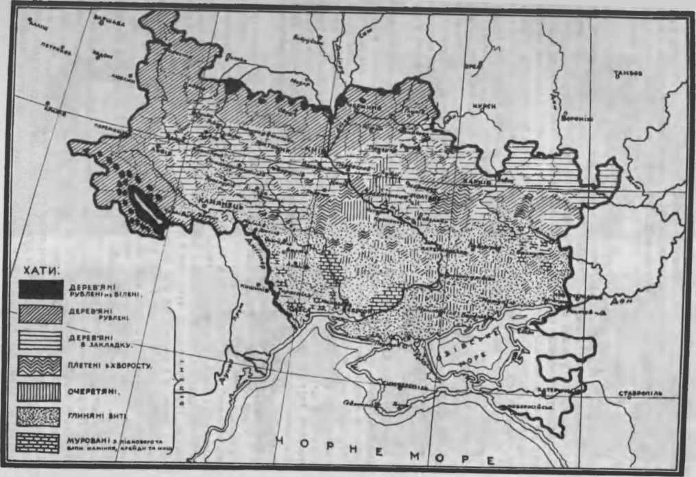 вані у сохи, обмазані глиною і так само, як і в усіх попередніх місцевостях та при всіх инших матеріялах, білені всередині і назверх. Смуга цих хат займає північні частини Харківщини, Полтавщини, а почасти й цілу Київщину. За нею йде вже смуга рублених дерев'яних хат, що, як до заможностн населення, трапляються скрізь: як виняток — біля Таганрога, досить часто — на Полтавщині та на Київщині і як загальне правило — тільки на Чернигівщи ні, на півночі Київщини, на Волині та далі на захід — в Галичннї І на Карпатах; але їх обмазують глиною та білять крейдою або гіпсом скрізь аж геть на північ та до самих гір в Галичині, де зникає вже ця ознака, що становить наявний пережиток старовини. Пдучи за системою, що ми вже її прийняли, розднвімся всі ці способи будування, починаючи з на «примітивніших.