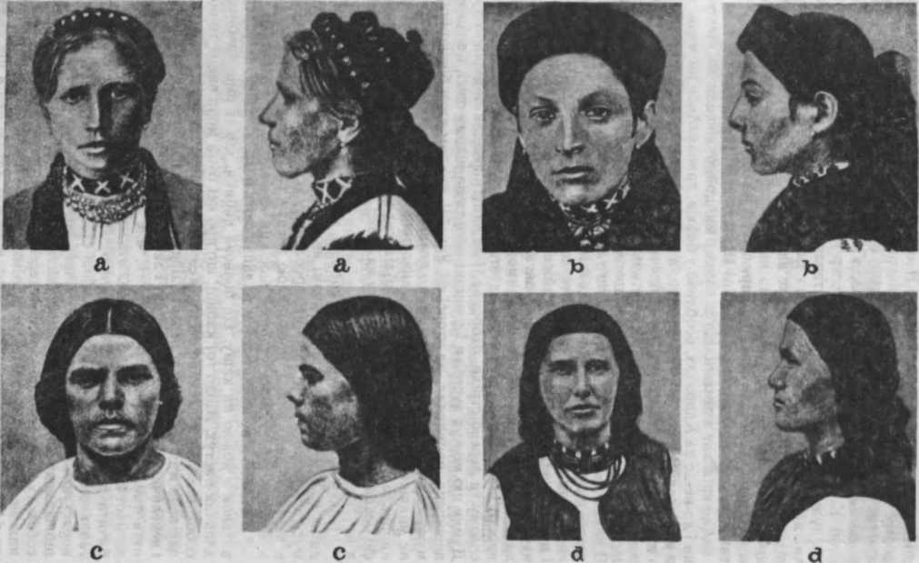 Зачіска замужніх жінок на Україні зовсім инша. Старовинний звичай, що ніколи не змінявся, безумовно вимагає, щоб волосся замужньої жінки було заховане під головним вкриттям, і «світити волоссям» або «ходити простоволосою» вважають для неї незвичайною непристойністю. Піл час моїх антропологічних подорожів мені і на Великій Україні, і в Галичині ніколи не при-ходнлося натрапляти на труднощі, коли я просив, наприклад, оголити коліно, але майже скрізь моя просьба скинути очіпок викликала найенергічиіші протести, що припинялись часом завдяки тільки інтервенції місцевого священика. Тому і зачіска замужніх жінок Зводиті>ся звичайно до того, що просто закручують волосся у вузол та підсовують його під очіпок. В деяких місцевостях, однак, замужні жінки, не заплітаючи кіс, ділять волосся иа дві половини, а потім, згорнувши кожну з них у джгут, намотують їх у протилежному напрямі на невелнчке луб'яне чи мотузяне кільце, що мас назву кибалки, і далі прикривають кибалку очіпком, або сітчастим, або особливої форми — розширеним зверху. У північно-західній частині Ковельського повіту на Волині та в цілій смузі Галичини, шо тягнеться від Волині до Карпат (Надвірна), волосся у замужніх жінок підтинають до рівня отвору вуха, а потім на нього вдягають невеликий очіпок та нав’язують навколо очіпка теж невелику хустину; коли хотять, очіпок та хустину здіймають з голови, як шапку у чоловіків, 3 під очіпка та хустини пидно кінці підстриженого волосся (табл IV, а). Старовинний звичай стинати волосся перед шлюбом існує в особливо примітивній формі у гуцулів: у них косу молодої прив'язують кінцем до дерев’яного кілочка, вбитого в стіну, а потім молодий з одного маху одрубує цей кінець своїм топірцем. У бойків у деяких місцевостях на Карпатах жінки ховають усе волосся під чіпець, але залишають перед вухами два довгих кучері на кшталт жидівських пейсів, що висять иноді до пояса (табл. ХНІ. d) Де-не-де, як, наприклад, у Побуці, «жони» в будні закручують волосся в два вузли по боках голови, а в свята розпускають їх по плечах, прикриваючи в обох випадках білою покришкою — те кою. що про неї скажемо далі.