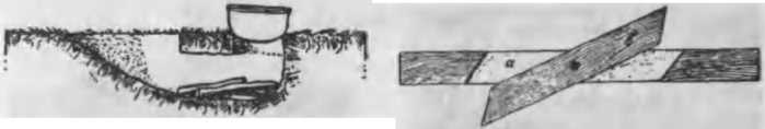 Ці сторожки також подібні до схилу стріхи, що зроблена з кілків та кори, але вони закриті з боків та мають маленький схил ще й з переднього підкри того боку. Для більшої стійкости на випадок вітру зверху накидано кілька деревин Цілком не подібні до попередніх будов, але дуже споріднений з ним характер мають, як своїм призначенням, так І тим, що вони теж иаціводкри-ті. так звані вишки: це ледве прикриті зверху та цілком відкриті з боків невеличкі поставлені на високих палях захистки для вартових. їх можна зачислити до форм тимчасового повітряного житла. Малюнок і на табл. VII сфотографовано р. 1910 на винограднику в станиці Верхнєетеблієвській на Кубані; в трохи удосконаленій формі це сторожова вишка колишніх запорожців. Сюди теж можна зачислити й переносні захистки, що їх вживають бойки. Вони або цілком подібні до польових, згаданих вище курінчиків та ставляться коло салаша. цебто також переносного загону дія овець, або подібні до якоїсь скрині па ніжках, збитої з дощок,— наче ліжко з дашком, куди на ніч залазить пастух. В степах південної України для цього чабани користуються або гарбою, цебто маленькою будкою на колесах, або спе-ціяльно до того пристосованим возом. На такому возі буває щось подібне до куріня. де можна не тільки спати, а й тримати харчі, ріжний струмент, ліки для овеїіь тощо. Вже значно досконалішу форму тимчасового житла становлять цілком закриті куріні, з отвором для входу; отвір цей можна завісити чим або зачинити дверима. Це типові будовн як неолітичних, так і багатьох пізніших напівдиких народів. Вони бувають круглі або прямокутні, надземні або панів підземні; иноді це тільки сама стріха, що звичайно буває конічна або двосхила, найчастіше солом'яна або очеретяна, а на плотах на Десні (табл. VI, f) та на північній Волині — з дерев’яних брусів. В селі Норинському Овручського повіту (табл. VU, g) та в Сушках Житомирського повіту нам довелось бачити таку будову, що цілком нагадує якийсь вігвам північноамериканських індійців: в землю вбито чотири сохи, що зв'язані вгорі перекладинами. На ці перекладини з трьох боків спираються косо поставлені дрюки, чи обаполкн. так, що вгорі зостається дірка для диму, а поверх них навалено глини; прохід між двома передніми сохами служить за двері. Коли дах двосхильний, то отвір між схилами лишається напіводкри-тий. цебто завішується матом або має двері (табл. VI, h). Дах цей лежить або просто на землі, або, коли жити в ній мають І за холодів, як. наприклад, добруджські рибалки-українці, то його ставлять над досить глибокою ямою, викопаною в землі; в кутах цієї ями забивають кілки, на яких і тримається дах; сох найчастіше буває ДВІ — одна ззаду, друга спереду, а на них лежить горизонтальний брус, що дає верхній опір цьому дахові. Вздовж довгих боків даху залишають один чи два уступи в землі, що заступають лавки, щоб сидіти та спати, а посередині або збоку стоїть припасований на кілках, забитих в землю, невеличкий столик. У Добруджі такі будови звуть і тепер колиби. А В гуцулів цю саму назву мають значно складніші, хоч також досить примітивні будови (мал. 4. а), де живуть дереворуби та сплавщики в горах.