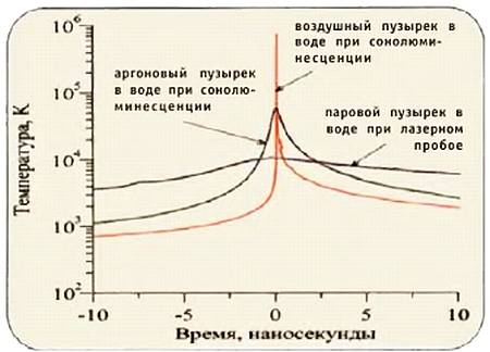 Именно в этот ничтожно короткий срок в самом центре микропузырька концентрируется огромная энергия. Температура там достигает миллиона градусов, как на Солнце, а плотность вещества в несколько раз превышает плотность воды!