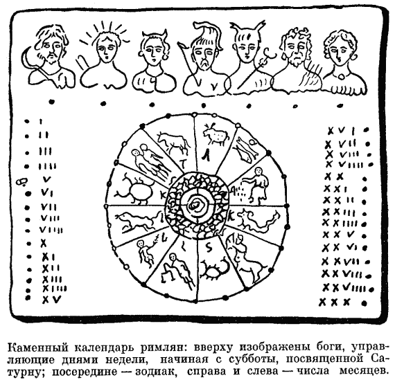 Из восточных стран проникли в Рим также нелепые астрологические измышления о влиянии планет на судьбы людей и семидневка. В юлианском календаре возродилась вавилонская неделя, все дни которой были распределены между богами-планетами. Первый день, посвященный богу Солнца, так и называли «господний день». К нему-то и приурочили христиане «воскресение» Христа. В эти дни собирались члены общин для совместных молитв, читали священное писание, причащались вином и хлебом.