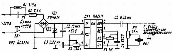 При использовании в электронных звонках микросхем телефонных вызывных устройств достигаются простота, малые габариты и потребление энергии, возможность регулирования уровня громкости. Принципиальная схема квартирного звонка на одной из таких микросхем показана на рис. 22.