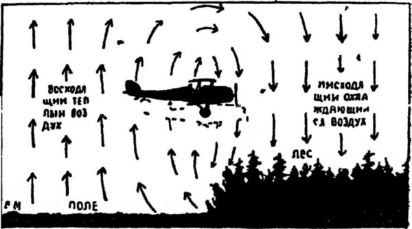 Дело в том, что поверхность земли нагревается солнцем неравномерно, например пахоть нагревается сильно, луга — меньше, лес еще меньше и т. д. Вследствие этого над пахотью нагретый воздух поднимается вверх быстрее, чем над лугами. Теплый воздух, поднявшийся над пахотью, начнет опускаться над лесом, где всегда прохладно. Самолет попадает то в подымающийся поток воздуха (рис. 36), то в опускающийся (рис. 37).
