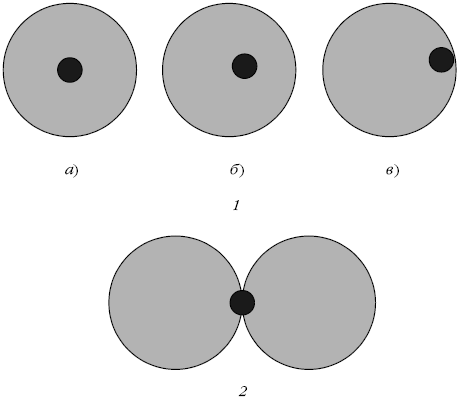 Рис. 3.6. Разновидности географического положения объектов относительно площадных структур (таксонов): 1 – внутри–(интра–)ареальное (а – центральное; б – эксцентрическое; в – периферийное); 2 – межареальное (пограничное)