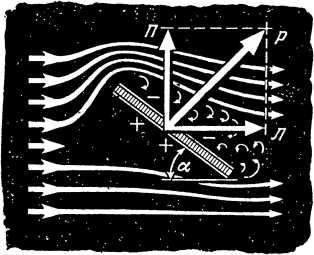 Рис. 12. Возникновение аэродинамической силы Р при несимметричном обтекании пластины и замена силы Р двумя аэродинамическими силами — подъемной силой П и силой лобового сопротивления Л.