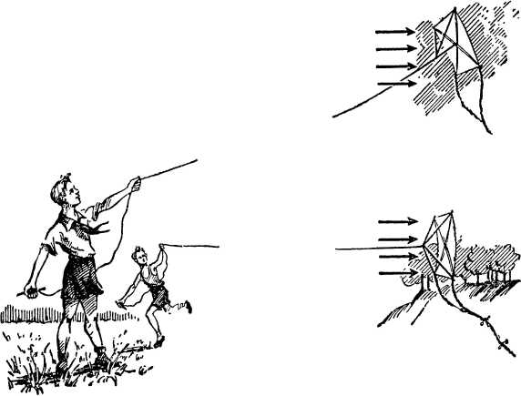Рис. 13. Полет воздушного змея: внизу — с неправильно построенной уздечкой, вверху — с правильно построенной уздечкой.