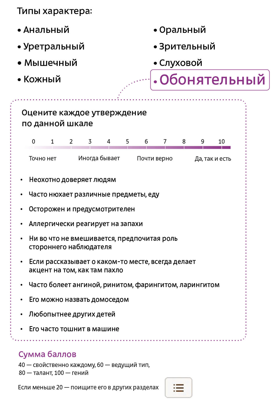 «Обонятельники» — природные хитрецы, которые обязательно добьются своего: если не хотят пойти в школу — «нагонят» себе температуру, если нужно получить желанную игрушку — притворятся самыми несчастными на свете, и ваше сердце растает. Такие дети просыпаются носом, втягивают воздух и сразу понимают, что день грядущий им готовит. Нос у них, как правило, от природы имеет внушительные размеры — Бог шельму метит… Родителям нужно быть готовыми к тому, что их дитя всегда будет в стороне от детских игр, может читать сутки напролет или углубиться в решение задач из арсенала студентов пятого курса. Такие дети часто вырастают в гениальных ученых-одиночек. Им как воздух нужны знания, они буквально питаются новыми идеями и с людьми общаются только для того, чтобы утолить свой информационный голод. Многогранные, глубокие натуры, они часто могут поделиться настоящими сокровищами знаний, но одна проблема — им с вами чаще всего неинтересно. К сожалению, с людьми они обращаются, как с книгами: прочитали от корки до корки — все, можно поставить на полку. Поэтому у них бывает штук 20 «лучших друзей» — по одному-два на каждый период жизни. Потом, встретив вас, могут не узнать…