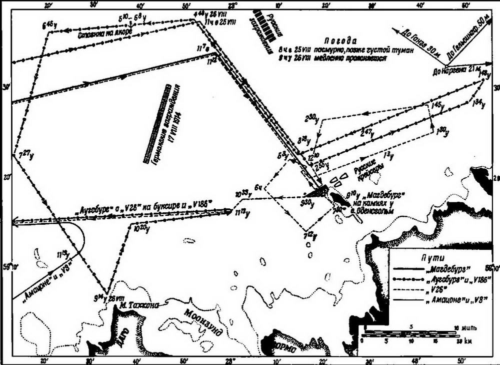 Операция по захвату германского крейсера «Магдебург», потерпевшего навигационную аварию на камнях о. Оденсхольм 13 августа 1914 г. (Схема из: Г. Ролльман. Война на Балтийском море. 1915-й год. / Пер. с нем. - М.: Госвоениздат, 1937)