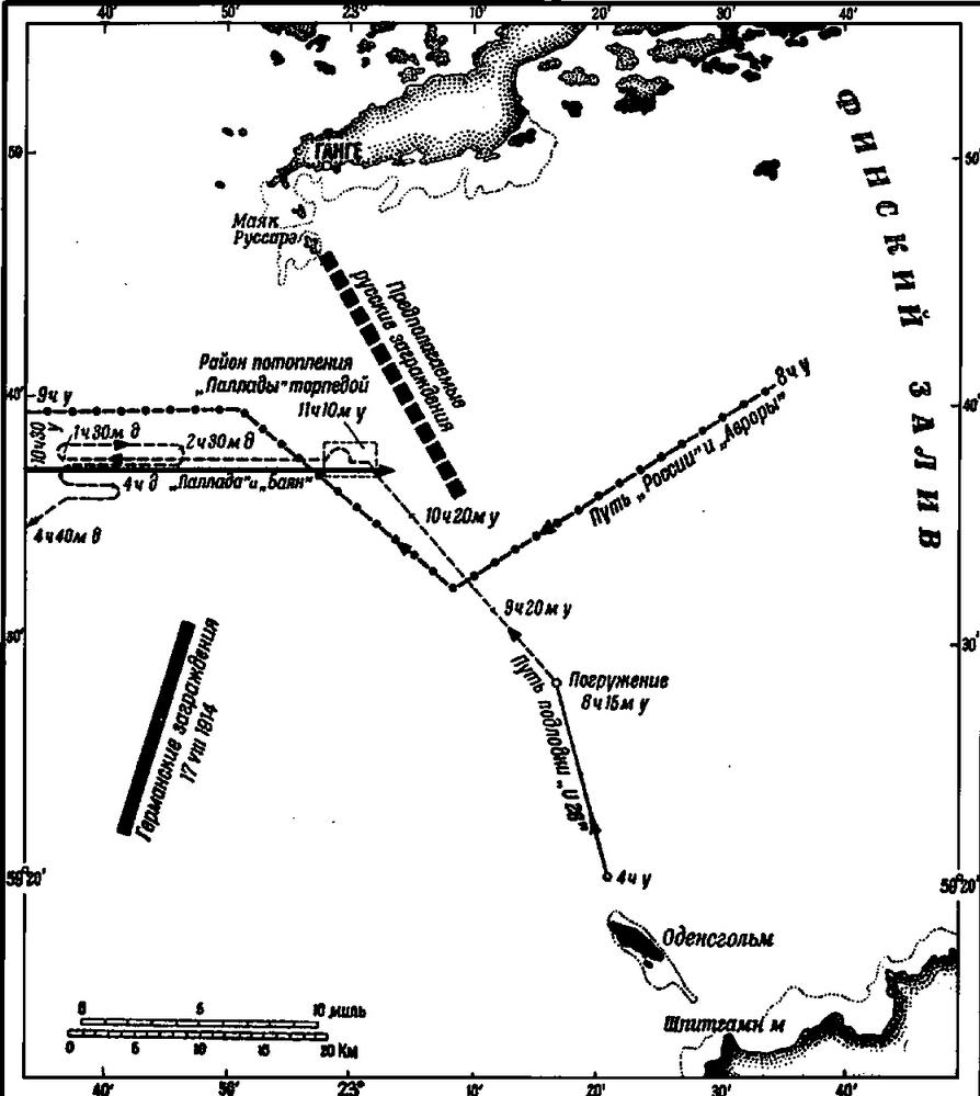 Первая встреча русских крейсеров с подводным противником произошла 27 сентября. В тот день в дозоре на меридиане о. Оденсхольм находились «Баян» и «Паллада», для поддержки которых и одновременного прикрытия сидевшей на мели подводной лодки «Аллигатор» в 7 час. утра из Лапвика вышли «Громобой» (флаг нового начальника 1-й бригады контр-адмирала М.К. Бахирева) и «Адмирал Макаров». На траверзе банки Аякс крейсера обнаружили парусную лайбу под голландским флагом, идущую курсом вест. Поскольку указаний о пропуске её в запретные для плавания гражданских судов районы не имелось, командир «Адмирала Макарова» капитан 1-го ранга П.М. Плен получил приказание задержать судно и направить затем в Балтийский порт. Подойдя в 8 час. 05 мин. к лайбе и приказав капитану последней возвращаться, крейсер дал 17-узловый ход, одновременно положив руль право на борт. Спустя пять минут, находясь в 11,5 милях к зюйд-весту от банки Аякс, на левом крамболе неожиданно был замечен след торпеды, прошедшей впереди по курсу на расстоянии одного кабельтова. Вслед за первой торпедой обнаружили и вторую, прошедшую значительно ближе - примерно в четверти кабельтова от крейсера.[10 В рапорте командира крейсера капитана 1-го ранга П.М. Плена (РГАВМФ, ф. 479, оп. 1, д. 315, л. 54) сообщается и о третьей торпеде, якобы прошедшей на расстоянии 0,5 кб под кормой. Однако подобное утверждение опровергается тем фактом, что подводная лодка U-26 имела два носовых и два кормовых 533 мм торпедных аппарата и, следовательно, не могла выпустить одновременно более двух торпед.]