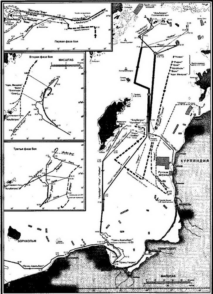 Между тем ещё ночью 19 июня флагманский радиотелеграфист капитан 2-го ранга И.И. Ренгартен, находившийся на радиостанции в Кильконде, дважды передал по радио контр-адмиралу Бахиреву расшифровку вражеских переговоров, ясно указывавших на то, что между 6 и 7 часами утра вблизи бригады предполагалось присутствие нескольких германских кораблей во главе с «Аугсбургом». Уничтожение в открытом бою хотя бы части неприятельских сил сулило гораздо большие перспективы, чем при обстреле Мемеля и М.К. Бахирев приказал идти на сближение с противником. В 5 час. 30 мин. туман рассеялся (при этом ни «Рюрика», ни «Новика» не было видно) и в это же время начальник бригады получил новое радио, уточняющее курс и скорость германского крейсера. В 6 час. 15 мин. русский отряд повернул к норд-осту «на пересечку неприятеля», а спустя ещё час, увеличив ход до 19 уз, лёг на курс 10°, ведущий к месту предполагаемой встречи с ним.