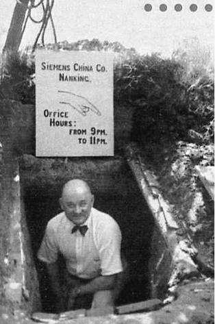 Рабе тотчас возвращается в китайскую столицу, оставив — безопасности ради — свою семью на севере страны. Все-таки он — не мечтательный курильщик опиума в притонах восточного городка, а ответственный служащий компании. Сослуживцы тронуты заботой шефа, их подкупают его уверенные команды, полное отсутствие паники. Так, сразу по прибытии в Нанкин он распорядился построить у себя в саду просторное бомбоубежище, в котором могли бы укрыться его сотрудники и члены их семей. Те не заставляют себя ждать, а у Йона Рабе, обладавшего незаурядным чувством юмора, появляется лишний повод пошутить над судьбой. Над дверью бомбоубежища он вешает табличку: «Время работы офиса — с 9 до 11 часов утра» (именно на это время приходятся обычно японские бомбардировки). Один из его помощников восторженно говорит: «Где будете вы, там останусь и я».