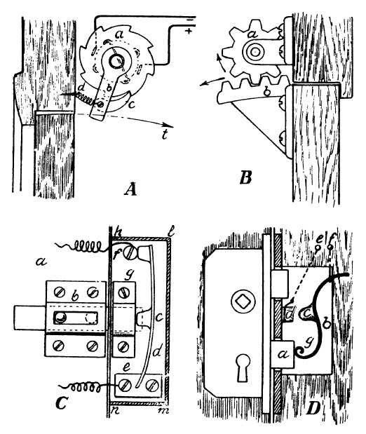На двери а привинчена задвижка b, показанная на рисунке выдвинутой. Ток идет через клемму с и пружину d с язычком е, входящим в скобку задвижки через клемму ?. При закрывании задвижки она выталкивает язычок е из скобки g; наконечник пружины d отходит вправо от клеммы ?, и ток прерывается.