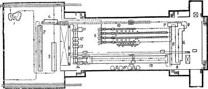 План завода-автомата компании Смита. 1 — автомат-приемщик; 2 — машина для окраски готовых рам; 3 — машина для промывки и протравки принятых балок; 4 — промывочная машина; 5 — дыропробивающие прессы; 6 — сборка рам; 7 — сшивающая рамы машина; 8 и 9 — контроль рам; 10 — четыре линии машин, обрабатывающих поперечины; 11 — изгибающий пресс; 12 — дыропробивающий пресс; 13 — отделочный пресс; 14 — формующий пресс; 15 — сборка продольных балок; 17 — машины для рессорных кронштейнов.