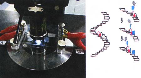Одна из бусин была прикреплена к стеклянной подложке, а вторая могла свободно вращаться вокруг первой — бусина двигалась под ударами молекул буферного раствора, в который была погружена вся система. Молекулы буфера приблизительно с равной частотой ударяли по бусине с разных сторон, заставляя вращаться то по часовой стрелке, то против.