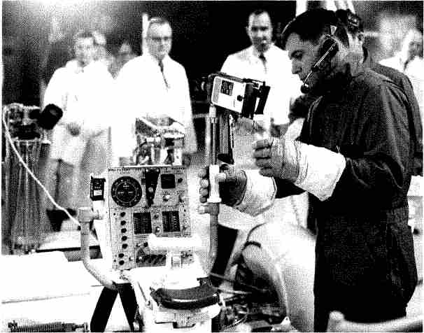 Рис. 6.88. Предполетная проверка оборудования ровера. В центре — пульт и ручка управления, слева — остронаправленная антенна в сложенном состоянии, справа от пульта — кинокамера.