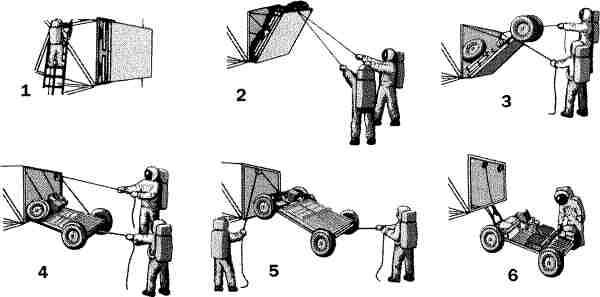 Рис. 6.90. Укладка ровера в грузовой отсек лунного модуля.