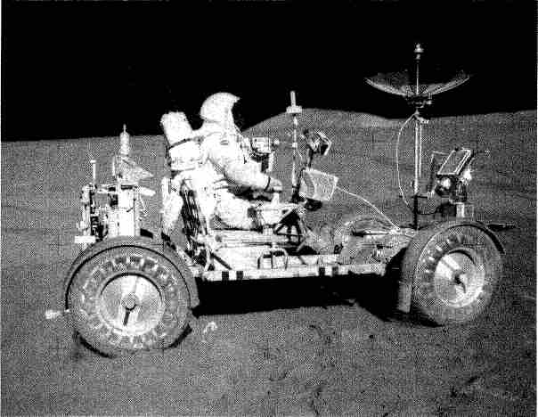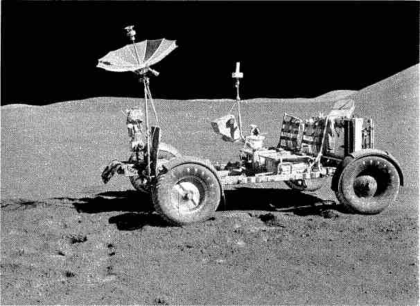 Рис. 6.89. Сделанный из алюминиевого сплава, ровер имеет массу 210 кг и способен брать груз в 490 кг. Длина корпуса 3 м, колесная база 2,3 м. Две серебряно — цинковые батареи по 121 А·ч каждая обеспечивают ресурс хода около 70 км.