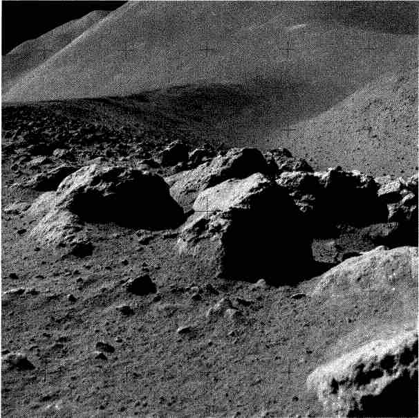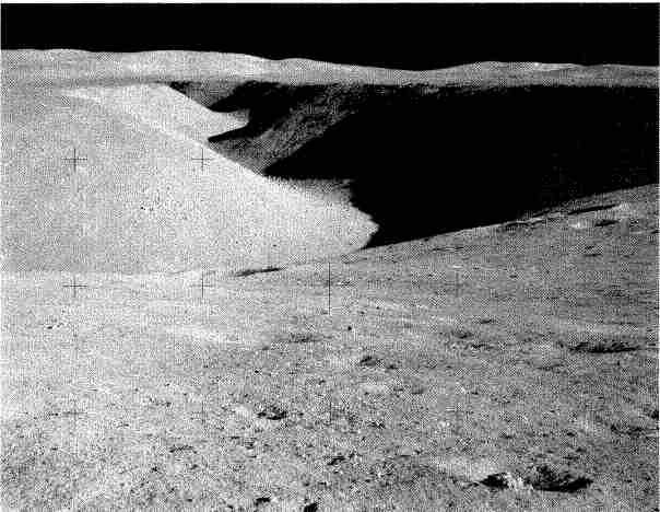 Резкого обрыва в пропасть Борозды не было. За 200–300 м до нее склон был пологим, слой реголита неглубоким, грунт под ним твердым. Но метров за 50 от края уклон возрос до 20°, а на самом краю обрыва, словно ограждение, выстроилась нестройная шеренга светло — серых валунов, лежащих прямо на каменном основании, почти не прикрытом реголитом. Поверхность пологого склона испещряли небольшие, 5-10 м в диаметре, кратеры с хаотично разбросанными между ними обломками крупнопористых базальтовых плит цвета бронзы, величиной от ботинка до чемодана. На срезе противоположного берега было видно множество слоев предполагаемых разливов лавы по равнине Хэдли. Сфотографировав все это и собрав образцы, стали спускаться к камням на более крутом участке склона.