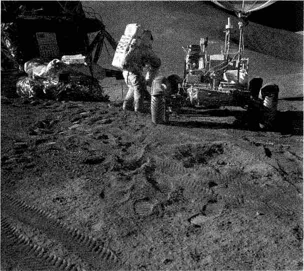 Джим полез на лестницу, чтобы заглянуть в секцию, и в этот момент ровер резко выдвинулся на ?· От неожиданного толчка Ирвин полетел с лестницы кувырком. Ровер вывалился, словно пьяный, и это обеспокоило командира не меньше, чем падение Ирвина. Джим уже стоял, веселый и слегка измазанный, а ровер висел на расколотом шарнире с вылетевшими узловыми шплинтами и расфиксированным передним мостом. С помощью консультаций из ЦУПа удалось отцепить его от связей с LM и скрепить узлы.