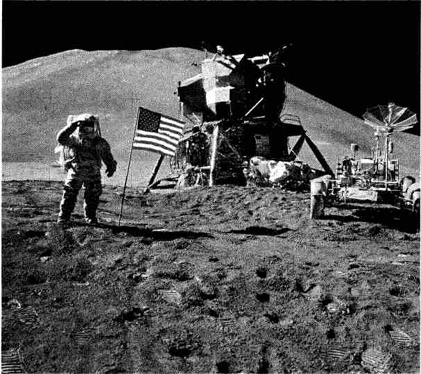 Рис. 6.101. Привет, земляне! Джеймс Ирвин и его лунное хозяйство на фоне гор Хэдли.