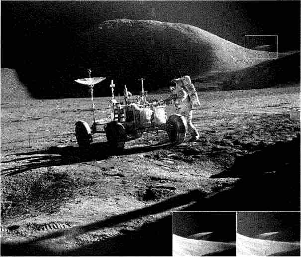 Рис. 6.102. Одна из самых популярных фотографий, доставленных экспедициями «Аполлон». На ней Ираин и ровер на фоне горы Хэдли. Но уфологи «увидели» здесь еще и ракетную базу пришельцев — в правом верхнем углу. Действительно, на газетных высококонтрастных отпечатках видно нечто похожее на нос ракеты или край летающей тарелки. Однако на мягких отпечатках отлично видно, что это просто игра света и тени на склонах холмов.