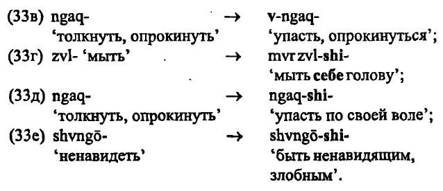 Префикс v- имеет также и антикаузативное значение, а суффикс shi- посессивно-рефлексивное, а также автокаузативное, абсолютивное и другие значения [LaPolla 2000: 288–296]; ср. соответственно: