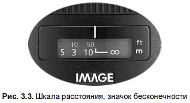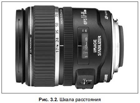 Обычно на большинстве объективов, выпускаемых для зеркальных камер, есть шкала расстояний. Когда вы крутите кольцо фокусировки, вы двигаете оптический блок или отдельную линзу, вдвигая или выдвигая его из неподвижного корпуса объектива, при этом меняется значение на шкале расстояний (рис. 3.2).