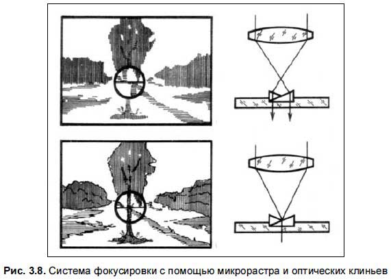 Из неавтофокусных систем, пожалуй, следует рассмотреть эти две системы (рис. 3.8 и 3.9). Часть снимаемого объекта разделяется с помощью оптических клиньев так, что в видоискателе два изображения кажутся немного смещенными одно против другого. Вращая оправу объектива, мы сопрягаем две половинки изображения до совпадения частей. Такая система себя хорошо зарекомендовала и применяется даже в современных камерах, однако плохо работает с длиннофокусными объективами[4].