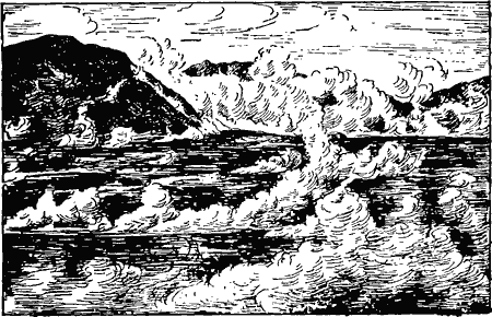 Рис. 14. Долина десяти тысяч дымов близ Катмаи. Видны бесчисленные струи пара и газов, выходящие из отверстий на дне долины.