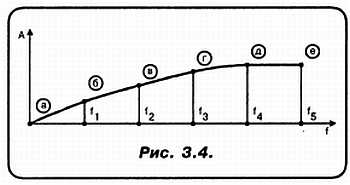 «А»: Ладно!.. Я рисую график! Ординате присваиваю обозначение А, тогда абсциссе — f. По английски f — friquensi — (частота) (см. рис. 3.3)! Тогда А, соответственно, амплитуда.